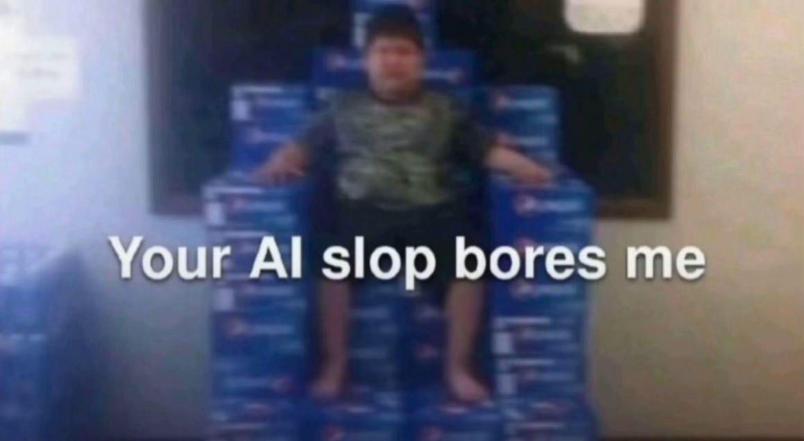 And right off the bat, almost instantly, the internet was drowning in what the culture has branded as “slop.” AI slop. It took fifteen years for the word spam to enter the common vocabulary. It took less than twelve months for AI slop to become a universal term of contempt. That is a cultural immune response. A generational antibody kicking in. The public did not need to be educated about why this stuff felt wrong. They felt it in their marrow. You click on anything now and the sensation is instantaneous, visceral, almost physical — a revulsion, a betrayal, that uncanny-valley nausea: this is obviously AI and I want actual images, actual words, actual anything made by a person who sweated and doubted and tried.